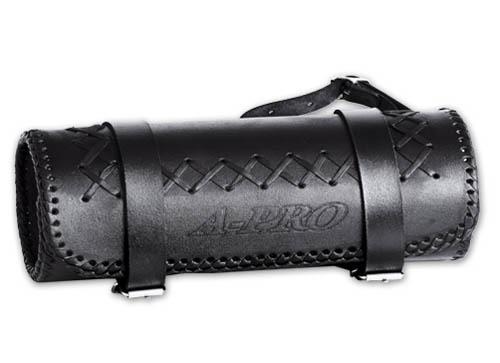 Laccioli con fibie per il fissaggio alla forcella oppure al telaio della moto . Patta decorata lungo tutto il lato di apertura da un'intreccio in rilievo .